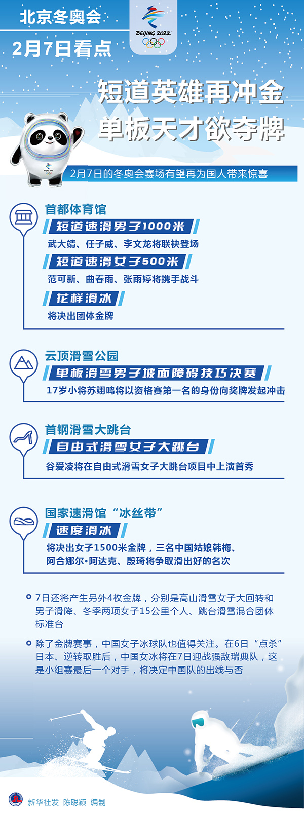 新華社北京2月6日電(記者張澤偉 王恒志)7日的冬奧會賽場有望再為國人帶來驚喜。為中國代表團(tuán)摘得首金的武大靖、任子威、范可新、曲春雨將再登冰場,沖擊短道速滑男子1000米和女子500米金牌。以資格賽頭名晉級的中國單板滑雪小將蘇翊鳴,將拿出更難的動(dòng)作沖擊男子坡面障礙技巧獎(jiǎng)牌,書寫中國雪上項(xiàng)目新的歷史。谷愛凌則將在自由式滑雪大跳臺項(xiàng)目中上演冬奧首秀。