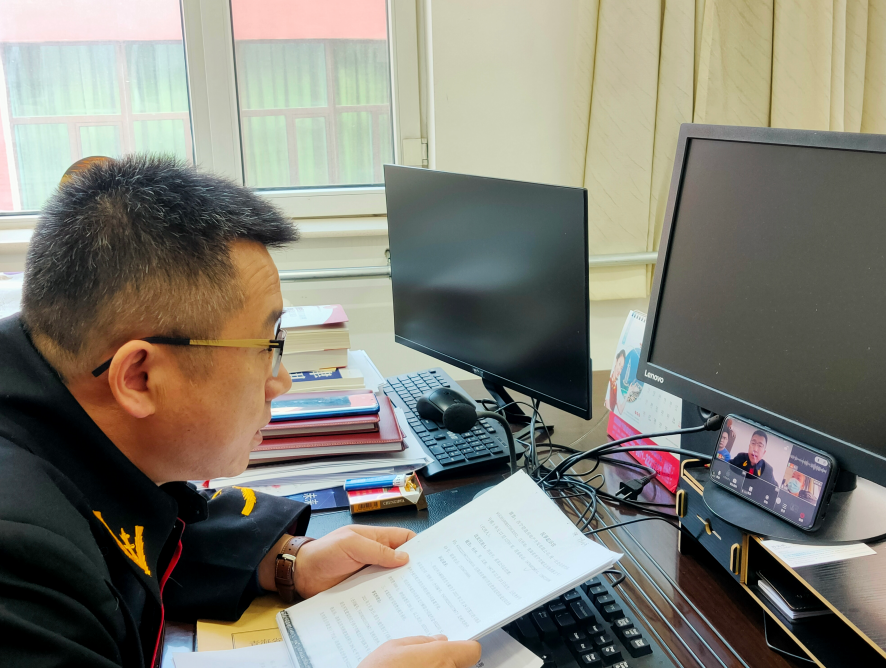 臘月二十八,《法治日?qǐng)?bào)》記者來到了青海省西寧市城北區(qū)法院廿里鋪法庭。此時(shí)法庭庭長張永平正身著法袍,坐在辦公室內(nèi),對(duì)著手機(jī)調(diào)解一起糾紛。原被告雙方代理人也同時(shí)出現(xiàn)在手機(jī)屏幕中。