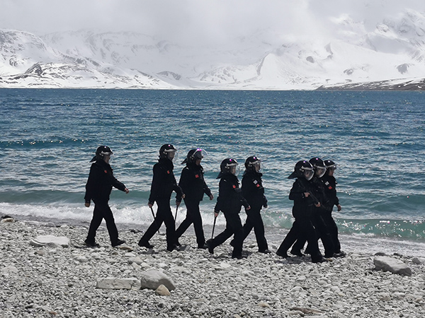 在20公分深的積雪地里,呂加駿深一腳淺一腳地前行,“小心腳下,這雪山下面有暗冰,別滑倒了”。呂加駿叮囑著身后的尼瑪頓珠,巡邏路是繞山體修建的上坡路,勉強(qiáng)能夠通行一輛車,靠山體的一側(cè)時不時滾落下零零散散的石頭,而另一邊就是懸崖峭壁,海拔近5000米的冰雪巡邏路上,不斷消耗著大家的體力,雙腳像被系上了幾十斤的重的大鐵鏈。寒冷而又稀薄的空氣吸入后,不斷刺激著肺部,呂加駿的胸口隱隱作痛,臉頰被凍得通紅,防寒帽的外檐早已結(jié)上了一層厚厚的沙冰。大家的喘氣聲越來越急促,踩在碎石雪上的吱呀聲越來越緩慢。