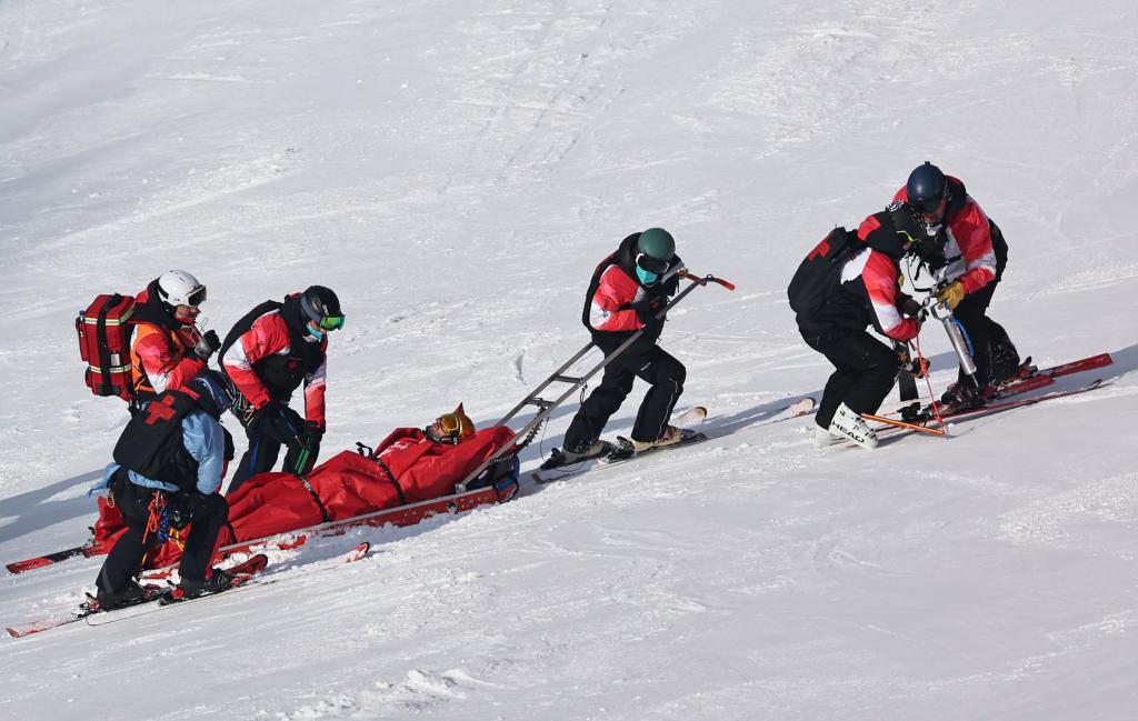 2月10日,高山滑雪醫(yī)療隊(duì)隊(duì)員用雪橇船將瑞士高山滑雪選手揚(yáng)尼克·夏布洛茨帶離賽道進(jìn)行進(jìn)一步救治。新華社記者陳斌攝