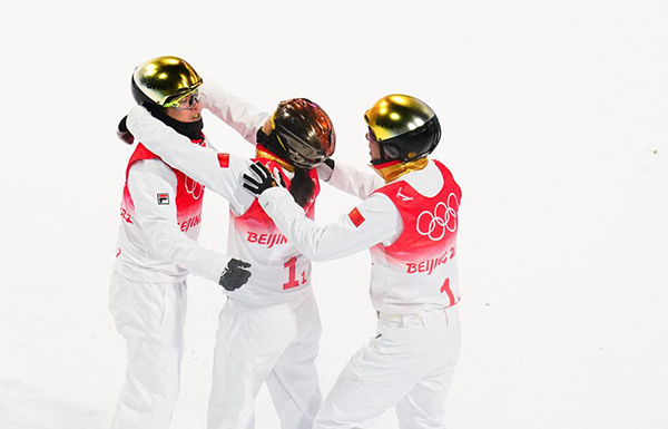 2月10日,中國隊(duì)選手徐夢(mèng)桃(中)與隊(duì)友齊廣璞(左)、賈宗洋在北京冬奧會(huì)自由式滑雪空中技巧混合團(tuán)體決賽后。新華社記者許暢攝