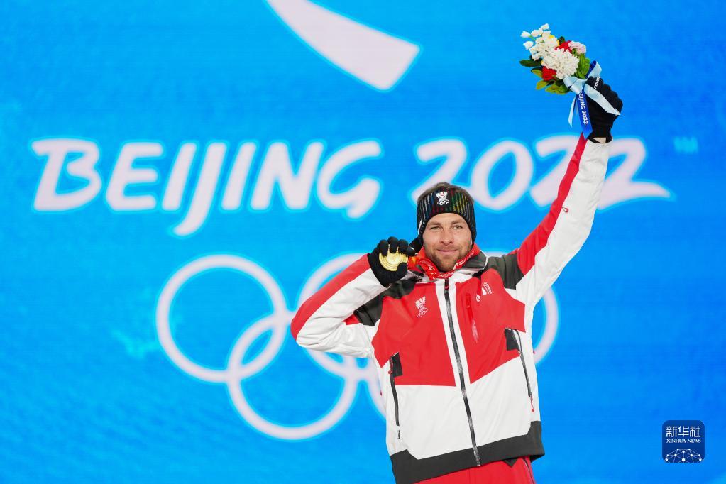 2月8日,單板滑雪男子平行大回轉(zhuǎn)比賽冠軍、奧地利選手本亞明·卡爾在獎牌頒發(fā)儀式上。新華社記者 朱崢 攝