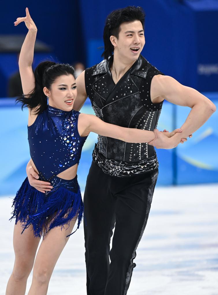 2月12日,中國選手王詩玥(左)/柳鑫宇在北京冬奧會花樣滑冰項目冰上舞蹈韻律舞比賽中。新華社記者馬寧攝