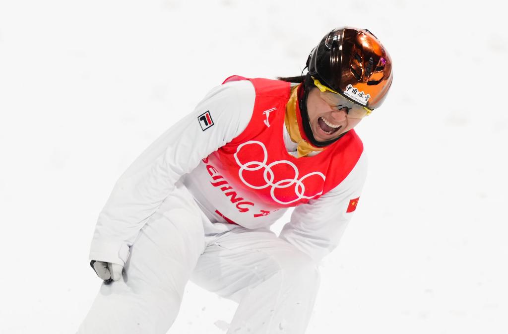 2月10日,中國隊選手徐夢桃在北京冬奧會自由式滑雪空中技巧混合團體決賽中慶祝。新華社記者薛玉斌攝