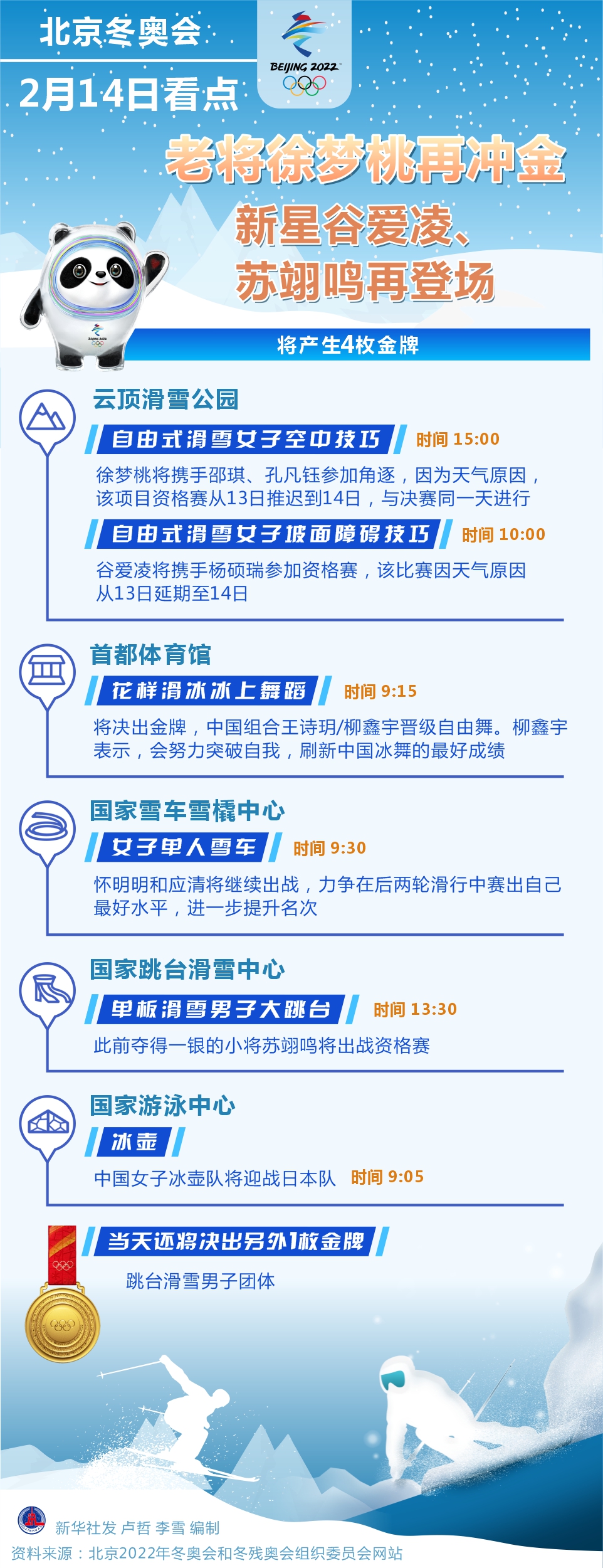 新華社北京2月13日電(記者張澤偉、王恒志)因為天氣原因,北京冬奧會部分項目調(diào)整了賽程,14日將產(chǎn)生4枚金牌。在自由式滑雪女子空中技巧項目上,中國隊實力不俗,“四朝元老”徐夢桃將再次向金牌發(fā)起沖擊。冰舞和雪車項目,中國選手則將力爭取得突破。
