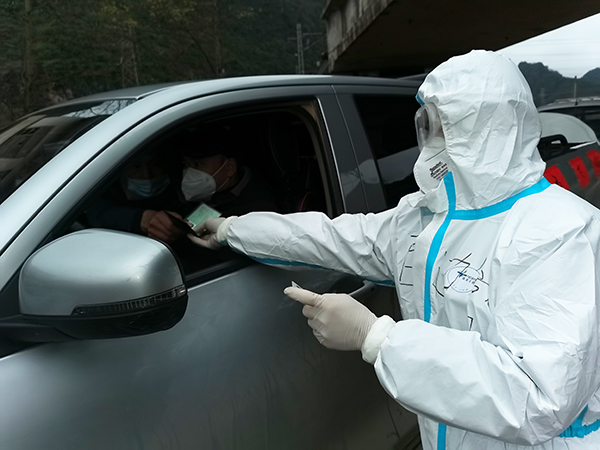 看到一輛面包車從遠(yuǎn)處駛來,楊京龍舉起手中的停車牌,示意司機(jī)停車接受檢查。“同志,你的通行證已過期,不能從這里通過?!笨吹剿緳C(jī)的通行證已過期,楊京龍耐心講解了疫情防控期間的交通管制政策,勸返司機(jī)。