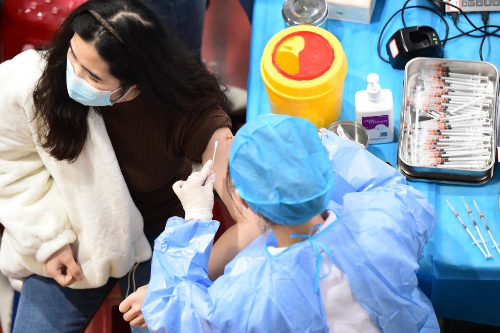 2022年1月6日,在安徽農(nóng)業(yè)大學(xué)新冠疫苗接種點(diǎn),醫(yī)護(hù)人員為師生接種新冠疫苗加強(qiáng)針。(新華社記者黃博涵 攝)