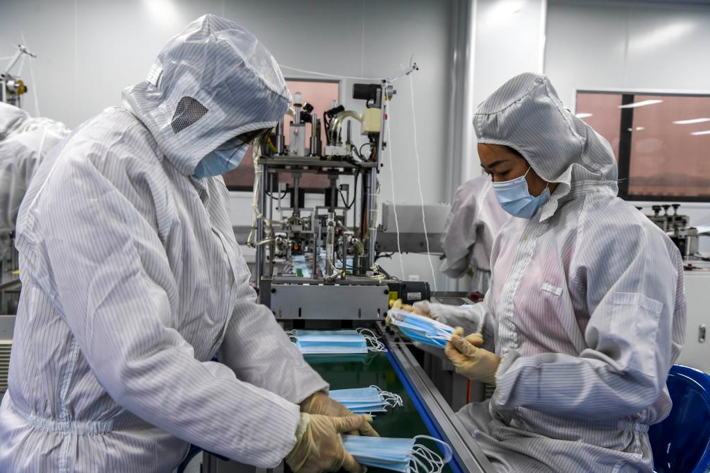 2022年2月18日,在廣西百色市一家口罩生產(chǎn)企業(yè)內(nèi),工作人員在生產(chǎn)線上忙碌。自2月15日零時(shí)起,廣西百色市部分縣(市、區(qū))解除“不進(jìn)不出”管控措施,當(dāng)?shù)卣行驈?fù)工復(fù)產(chǎn)。(新華社記者曹祎銘 攝)