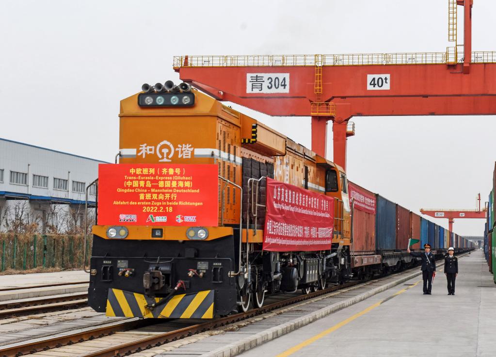2月18日,中歐班列(齊魯號(hào))中國(guó)青島—德國(guó)曼海姆雙向?qū)﹂_(kāi)首班列車(chē)從上合示范區(qū)青島多式聯(lián)運(yùn)中心出發(fā)。(新華社發(fā),王昭脈攝)