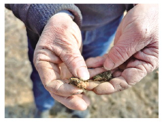 郭建軍從地上撿起一塊幾十年才形成的腐殖質和土壤碳化層。 盧偉 攝