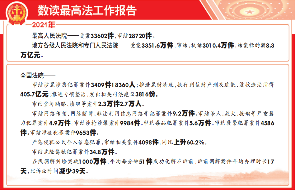 過去一年,司法前行的印記更加清晰,法治中國的腳步更加堅(jiān)毅,報(bào)告中的一個(gè)個(gè)案例,傳遞了鮮明的價(jià)值導(dǎo)向,讓法律條文走進(jìn)千家萬戶。報(bào)告中的一串串?dāng)?shù)據(jù),勾勒出平安中國、法治中國建設(shè)新成效:2021年,最高人民法院受理案件33602件,審結(jié)28720件,制定司法解釋24件,發(fā)布指導(dǎo)性案例31個(gè);地方各級(jí)人民法院和專門人民法院受理案件3351.6萬件,審結(jié)、執(zhí)結(jié)3010.4萬件,結(jié)案標(biāo)的額8.3萬億元,助推實(shí)現(xiàn)國家安全、社會(huì)安定、人民安寧。