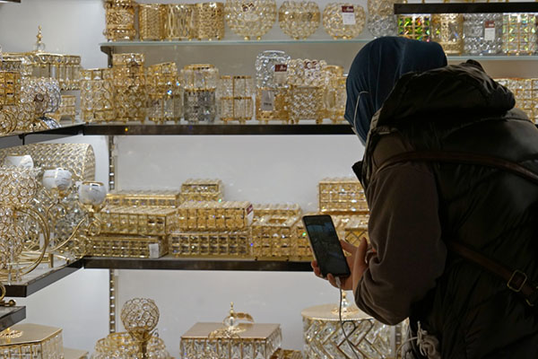 義烏國際商貿(mào)城一家水晶商鋪內(nèi),業(yè)務(wù)員小丁正在貨架前進(jìn)行遠(yuǎn)程視頻連線,手機(jī)的另一頭連著巴勒斯坦。受疫情影響,海外客商來華不便,遠(yuǎn)程直播成為其采購之“眼睛”?!翱蛻魮?dān)心這個(gè)燈臺尺寸比較大,運(yùn)費(fèi)會(huì)不會(huì)比較貴?”業(yè)務(wù)員小丁問?!皼]問題,主體和燈座可以拆卸,包裝不占空間?!鄙啼佖?fù)責(zé)人劉榮斌立即回復(fù)。