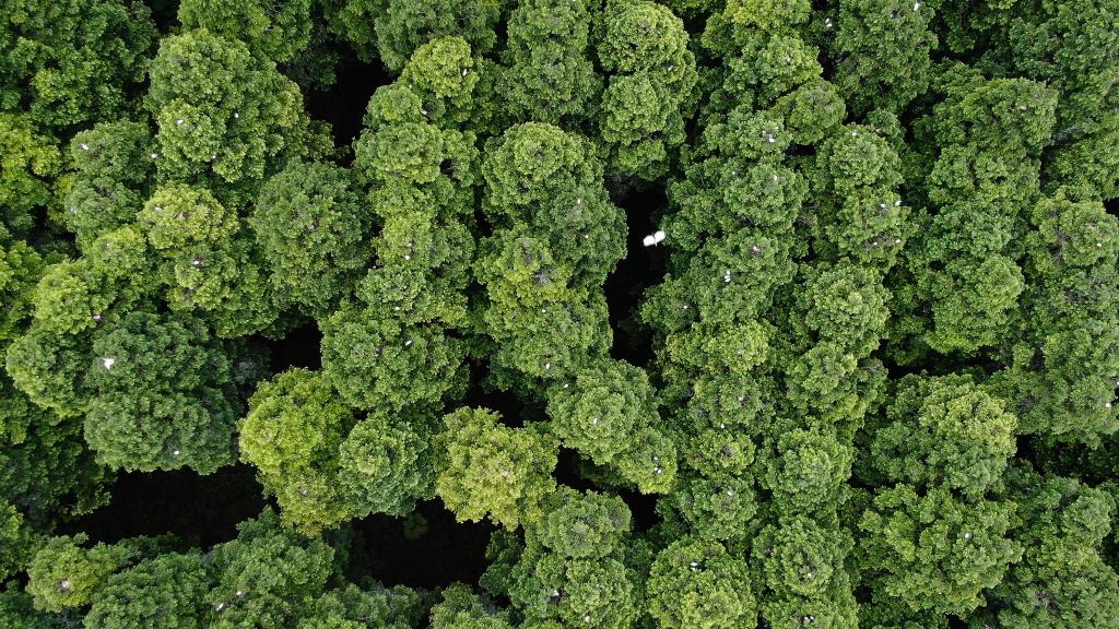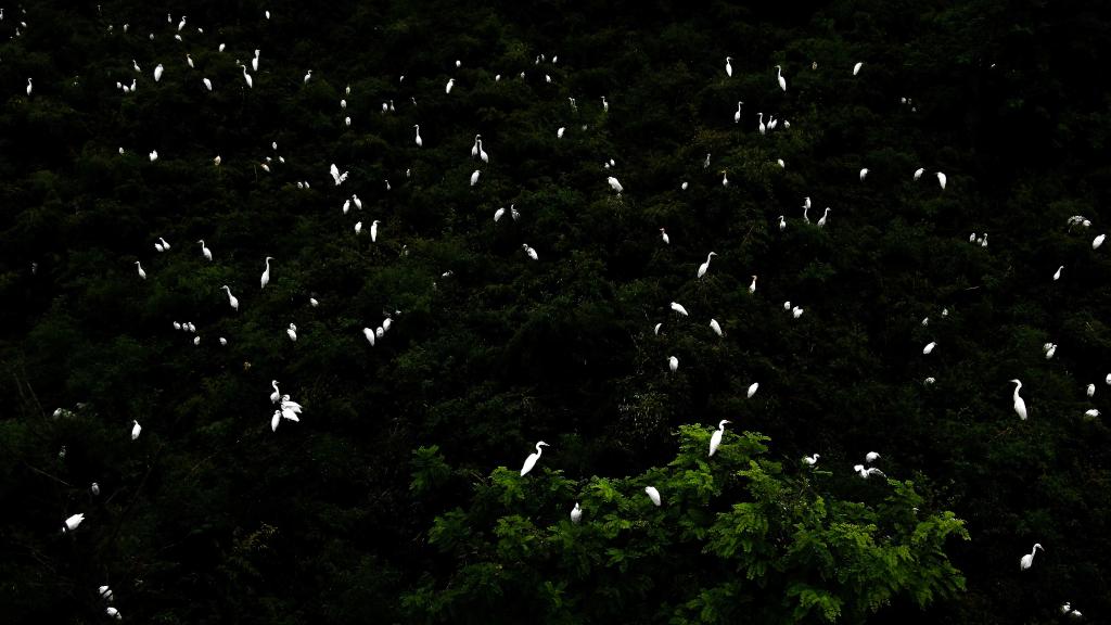 在江蘇省大豐麋鹿國(guó)家級(jí)自然保護(hù)區(qū),大量白鷺在樹頂棲息。(無(wú)人機(jī)拍攝)新華社記者李響攝