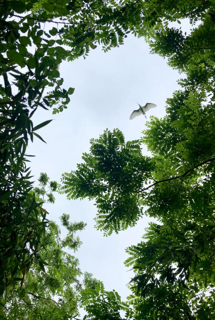 在江蘇省大豐麋鹿國(guó)家級(jí)自然保護(hù)區(qū),一只白鷺飛過樹梢。新華社記者李響攝