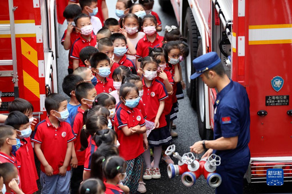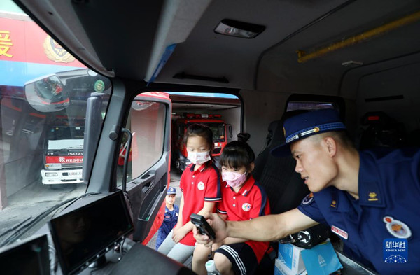 5月30日,在湖南省資興市消防救援大隊(duì),小朋友們?cè)谙绬T的帶領(lǐng)下參觀消防車。