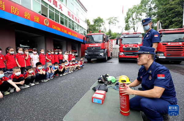 5月30日,在湖南省資興市消防救援大隊(duì),消防員為小朋友們講解滅火器的使用方法。