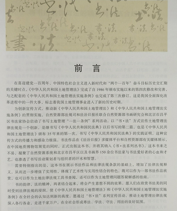 書以馭字,法以興邦;書法一體,墨法同彰。本書既可以作為一部書法作品欣賞,也可以作為土地法律法規(guī)工具書查閱,還可以作為土地管理問題答疑解惑的指南。希望這套叢書可以讓讀者在欣賞書法美的同時受到法律法規(guī)的浸潤,推動土地管理法律法規(guī)深入各行各業(yè)、走進千家萬戶,在全社會形成尊法、學法、守法、用法的良好氛圍。