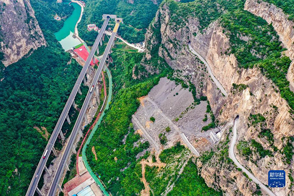 這是通過山西省長治市平順縣虹梯關(guān)鄉(xiāng)的高速公路(畫面左側(cè)),一旁是過去的“掛壁公路”(畫面右側(cè))(2022年7月5日攝,無人機照片)。新華社記者 曹陽 攝