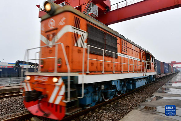 一列中亞班列從山西中鼎物流園駛出(2020年2月27日攝)。新華社記者 曹陽 攝