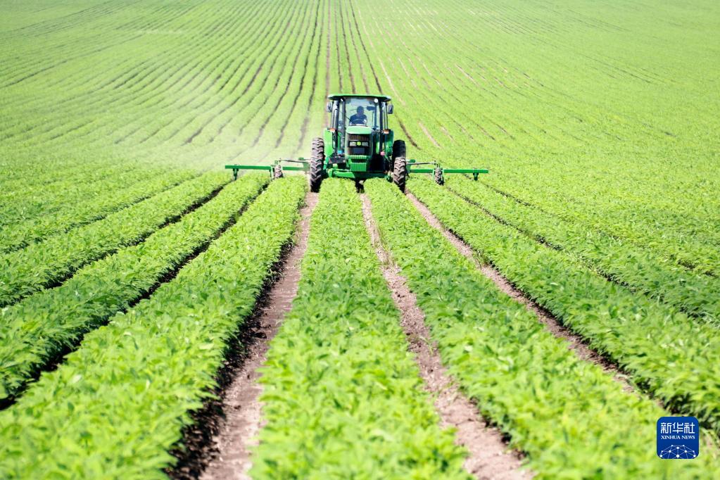 黑龍江北大荒農(nóng)墾集團(tuán)五大連池農(nóng)場有限公司工作人員進(jìn)行大豆中耕除草作業(yè)(2022年6月29日攝)。新華社發(fā)(陸文祥 攝)