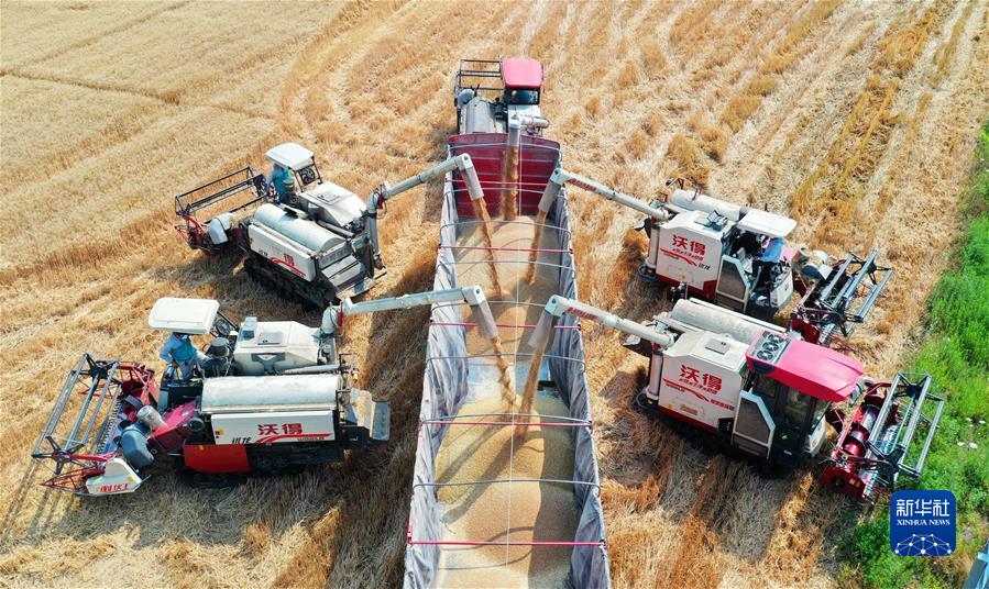 在合肥市蜀山區(qū)小廟鎮(zhèn)段沖村,收割機(jī)將小麥裝車,確保顆粒歸倉(cāng)(2022年5月25日攝,無(wú)人機(jī)照片)。新華社發(fā)(陳三虎 攝)