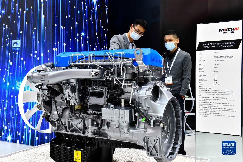 在山東濟(jì)南召開(kāi)的第二屆世界內(nèi)燃機(jī)大會(huì)上,濰柴集團(tuán)展示的高熱效率柴油發(fā)動(dòng)機(jī)(2021年4月21日攝)。新華社記者 郭緒雷 攝