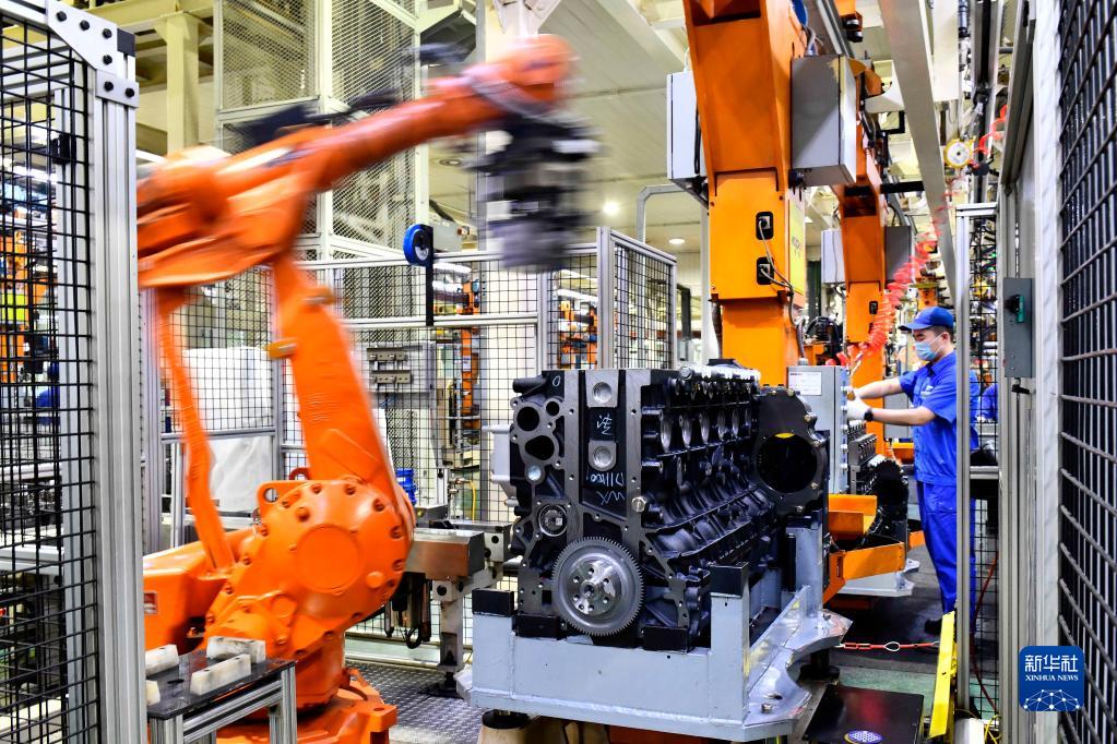 在位于山東濰坊的濰柴集團(tuán)總裝車(chē)間,機(jī)器人在流水線(xiàn)上裝配發(fā)動(dòng)機(jī)(2021年4月22日攝)。新華社記者 郭緒雷 攝