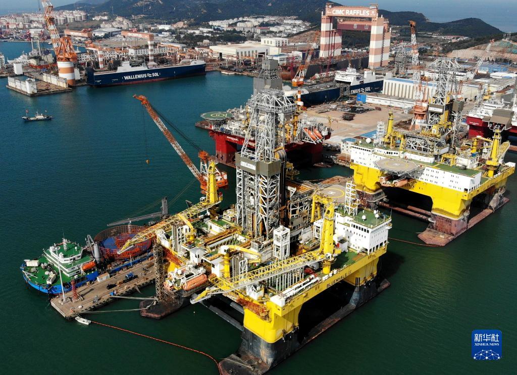 這是“藍(lán)鯨1號(hào)”(前右)及姊妹平臺(tái)“藍(lán)鯨2號(hào)”(前左)在其生產(chǎn)基地中集來(lái)福士海洋工程有限公司煙臺(tái)基地進(jìn)行維護(hù)和保養(yǎng)(2021年10月18日攝,無(wú)人機(jī)照片)。新華社記者 李紫恒 攝