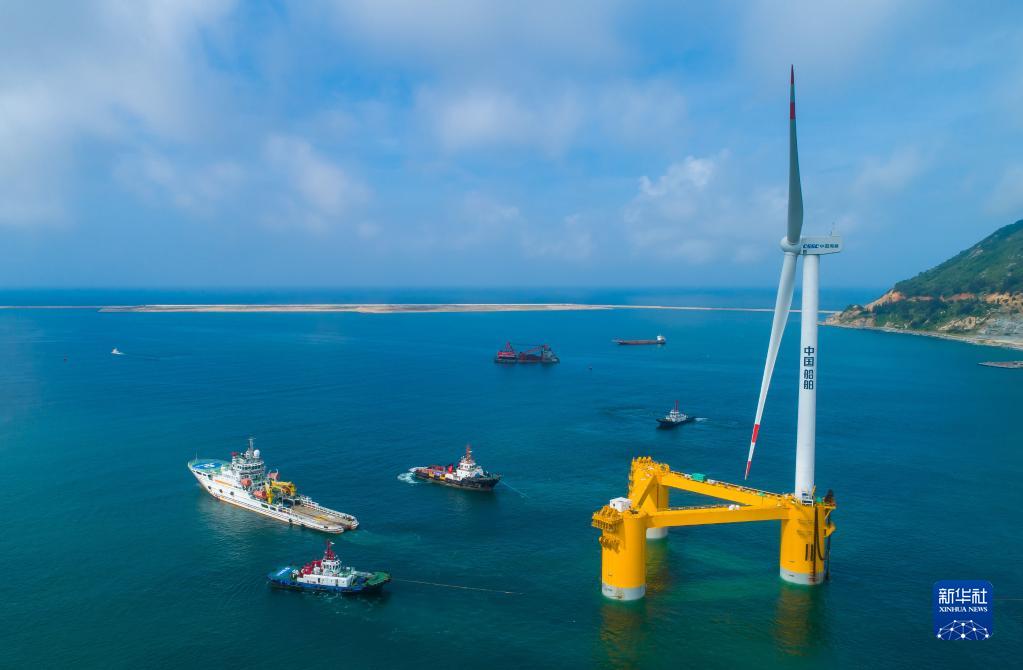 國內(nèi)首臺深遠海浮式風電裝備“扶搖號”從廣東省茂名市廣港碼頭拖航前往羅斗沙海域進行示范應(yīng)用(2022年5月29日攝,無人機照片)。新華社記者 劉大偉 攝