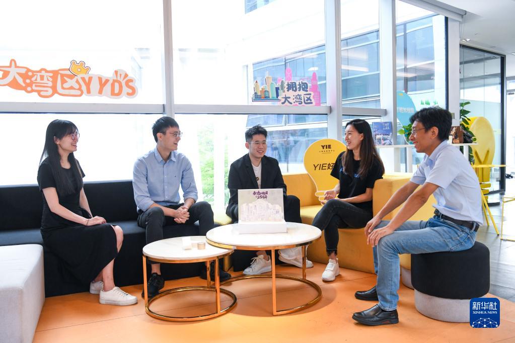 在位于深圳市的前海深港青年夢工廠,香港創(chuàng)業(yè)青年們一起交流各自的創(chuàng)業(yè)項目(2022年6月20日攝)。新華社記者 梁旭 攝