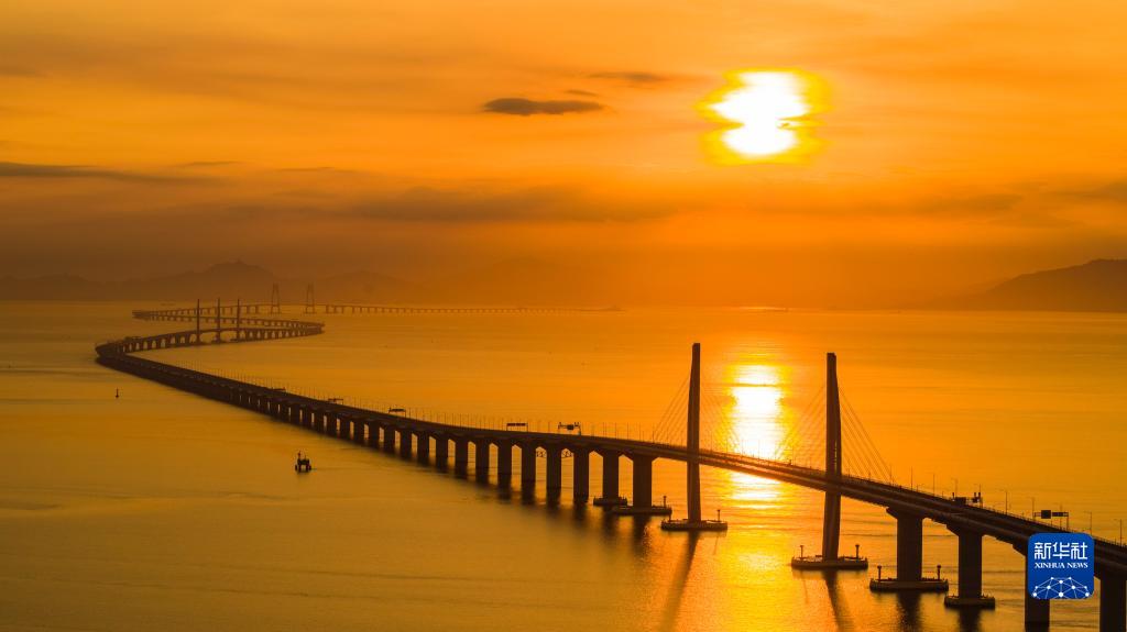 港珠澳大橋海上日出(2019年8月7日攝,無人機照片)。新華社發(fā)