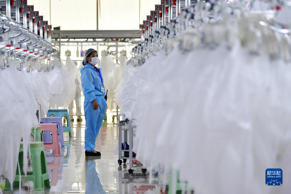 在甘肅省臨夏回族自治州積石山保安族東鄉(xiāng)族撒拉族自治縣,依托東西部扶貧協(xié)作平臺引進的服裝加工企業(yè)甘肅拓奇扶貧車間的員工在服裝加工生產(chǎn)線上作業(yè)(2020年8月9日攝)。新華社記者 陳斌 攝