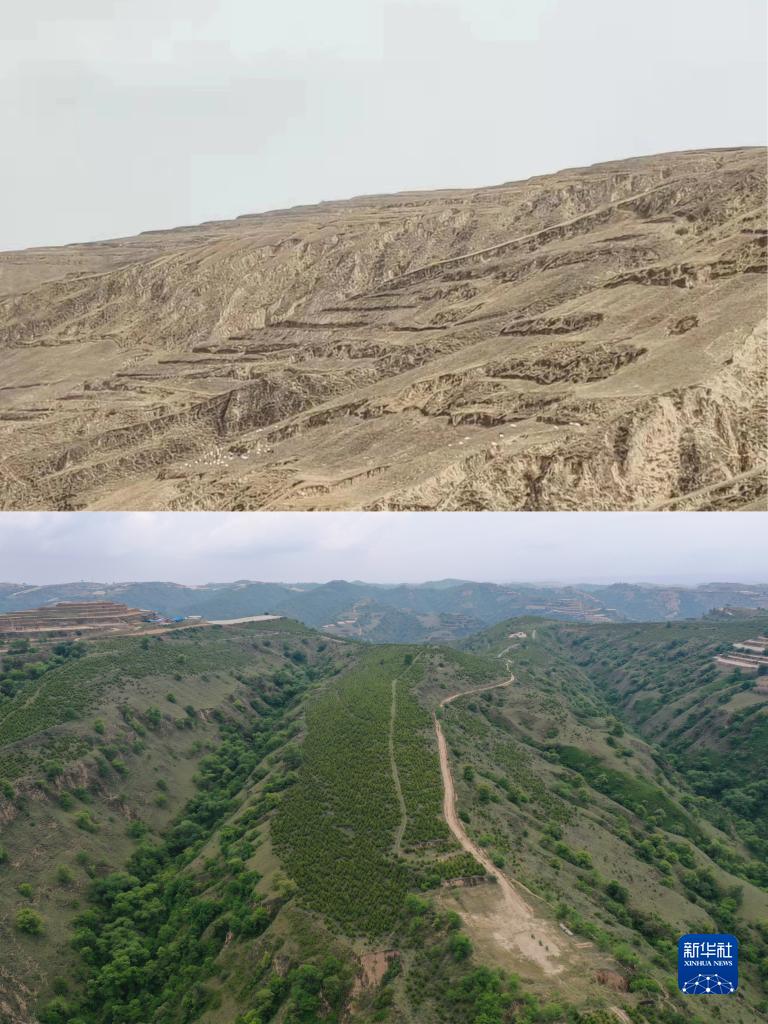 拼版照片:上圖為2013年拍攝的甘肅省慶陽市華池縣南梁鎮(zhèn)高臺村荒山景象(資料圖片,華池縣自然資源局供圖);下圖為2022年5月25日拍攝的甘肅省慶陽市華池縣南梁鎮(zhèn)高臺村萬畝苗林示范點景象(無人機照片,新華社記者杜哲宇攝)。新華社發(fā)