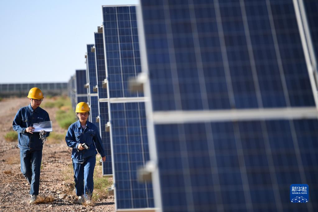 2022年6月13日,光伏電站工作人員李靜(右)和同事在甘肅省金昌市華能集團西坡光伏電站現(xiàn)場巡檢。新華社記者 陳斌 攝