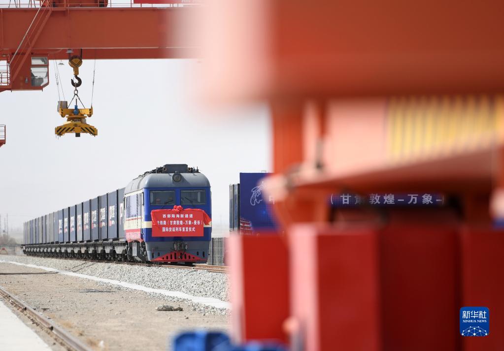 2022年4月21日,甘肅首趟中老鐵路國際貨運列車在敦煌市鐵路西貨站綜合貨場等待發(fā)車。新華社記者 陳斌 攝
