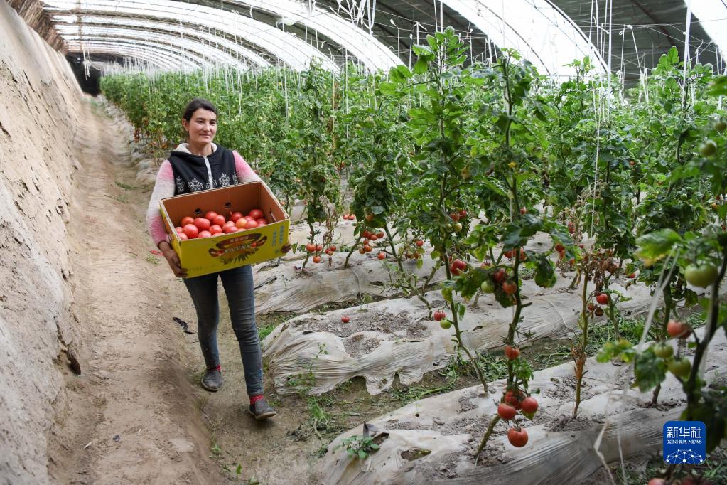 在新疆莎車縣伊什庫力鄉(xiāng)設(shè)施農(nóng)業(yè)基地,種植戶搬運剛采摘的西紅柿(2020年3月18日攝)。該設(shè)施農(nóng)業(yè)基地是在上海援疆莎車分指揮部協(xié)調(diào)推動下建立的。新華社記者 丁磊 攝