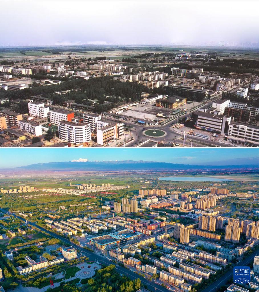 拼版照片:上圖為2000年拍攝的新疆生產(chǎn)建設(shè)兵團(tuán)農(nóng)六師五家渠市(資料照片);下圖為2020年7月26日無人機(jī)拍攝的新疆生產(chǎn)建設(shè)兵團(tuán)第六師五家渠市(李華北攝)。新華社發(fā)