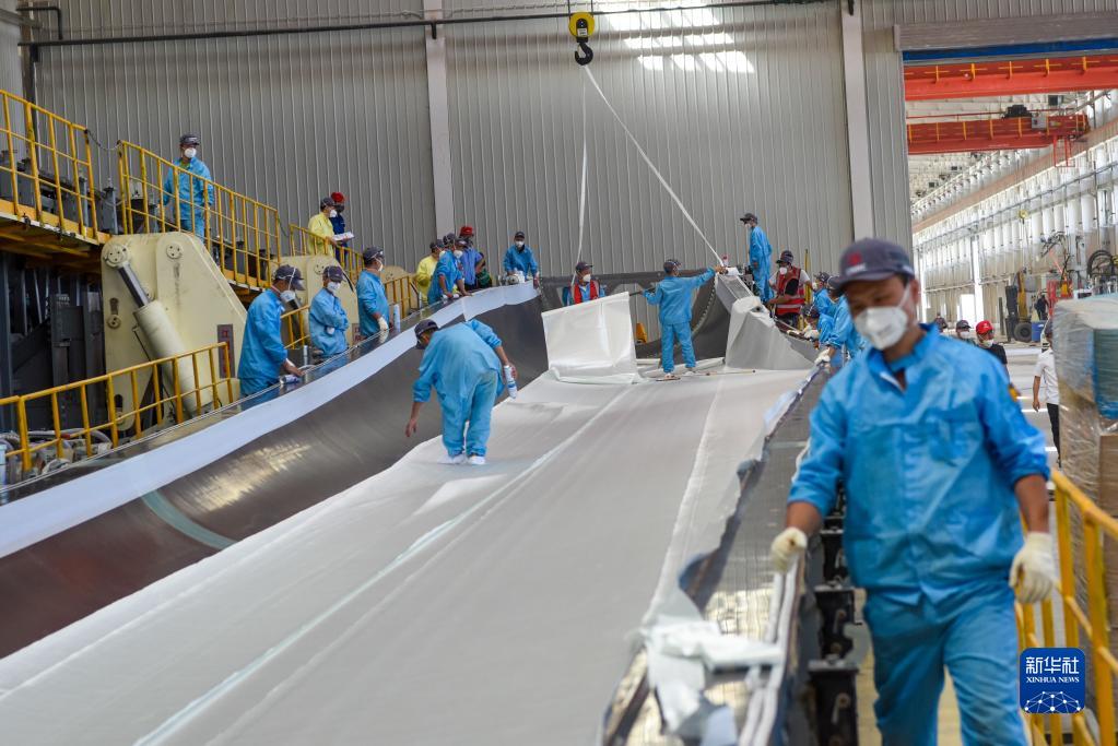 新疆生產(chǎn)建設(shè)兵團(tuán)新星經(jīng)濟(jì)技術(shù)開發(fā)區(qū)一家風(fēng)電葉片企業(yè)的員工在車間忙碌(2022年7月27日攝)。新華社記者 丁磊 攝