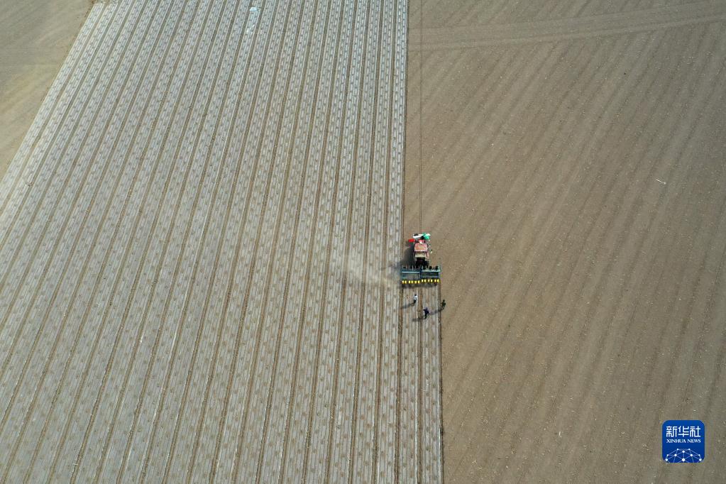 在新疆生產(chǎn)建設(shè)兵團(tuán)第六師共青團(tuán)農(nóng)場(chǎng)的棉田里,職工操作搭載北斗導(dǎo)航系統(tǒng)的播種機(jī)進(jìn)行春播(2022年4月19日攝,無人機(jī)照片)。新華社記者 丁磊 攝
