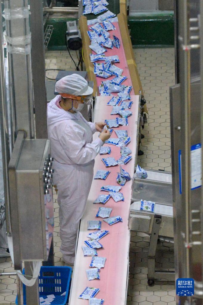新疆天潤(rùn)乳業(yè)股份有限公司的工作人員在生產(chǎn)線上忙碌(2020年3月1日攝)。新華社記者 丁磊 攝