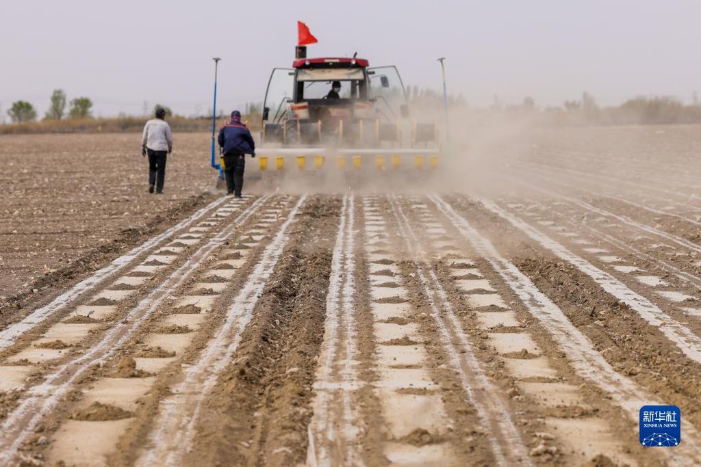 在新疆生產(chǎn)建設(shè)兵團(tuán)第六師共青團(tuán)農(nóng)場(chǎng)的棉田里,職工操作搭載北斗導(dǎo)航系統(tǒng)的播種機(jī)進(jìn)行春播(2022年4月19日攝)。新華社記者 丁磊 攝
