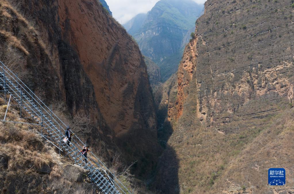 2020年5月13日,四川省涼山彝族自治州昭覺縣支爾莫鄉(xiāng)“懸崖村”——阿土列爾村高山區(qū)的貧困戶沿著鋼梯下山,準備搬進昭覺縣城易地扶貧搬遷安置點的新家(無人機照片)。新華社記者 江宏景 攝