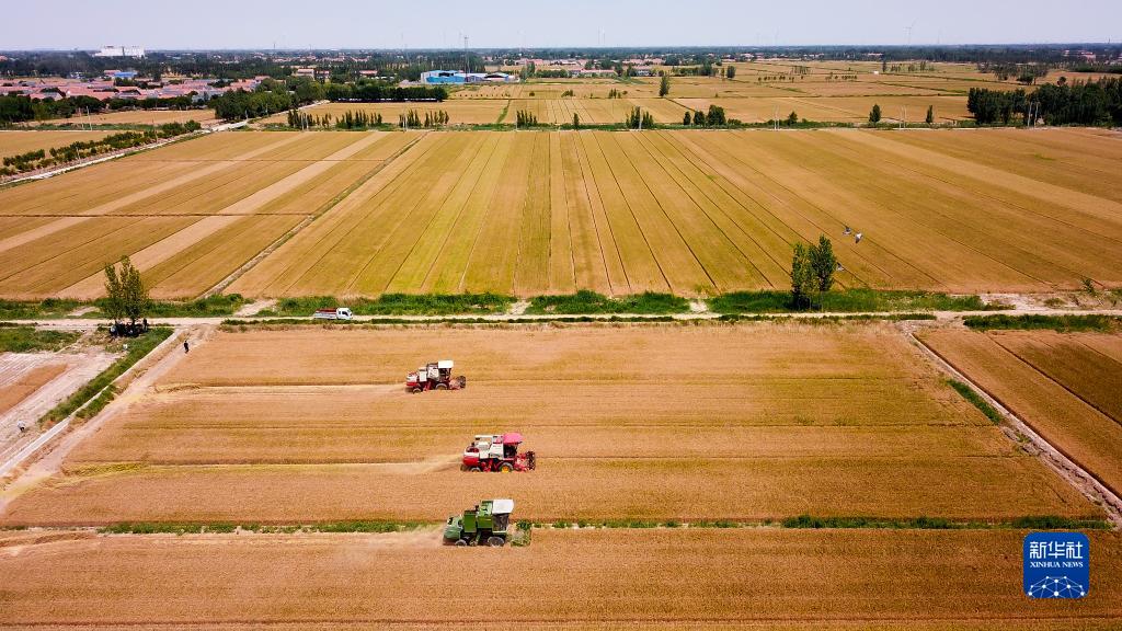 2022年6月7日,在山東省惠民縣桑落墅鎮(zhèn),農(nóng)民駕駛農(nóng)機收獲小麥(無人機照片)。新華社記者 郭緒雷 攝