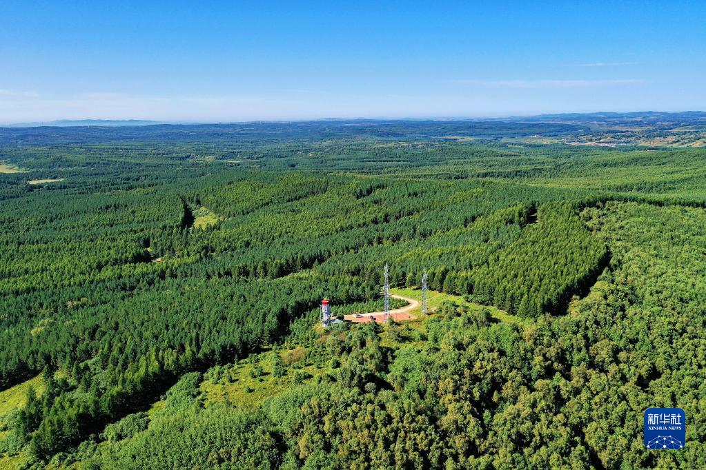 這是2021年8月23日拍攝的河北塞罕壩機械林場內(nèi)的望海樓(無人機照片)。三代塞罕壩林場人50多年堅持植樹造林,用汗水澆灌出綠波涌動的百萬畝人工林海。新華社記者 牟宇 攝