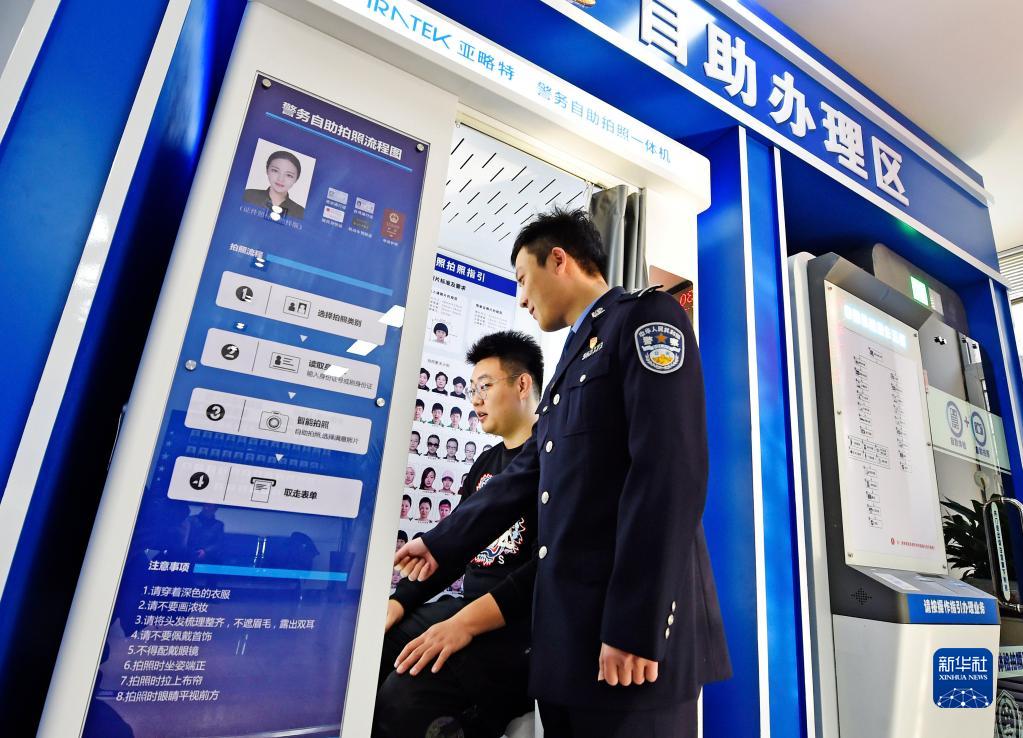 在遼寧省本溪市公安局北地派出所民警指導(dǎo)下,市民通過自助體檢機(jī)完成機(jī)動車駕駛?cè)藱z測項(xiàng)目(2021年12月10日攝)。新華社發(fā)