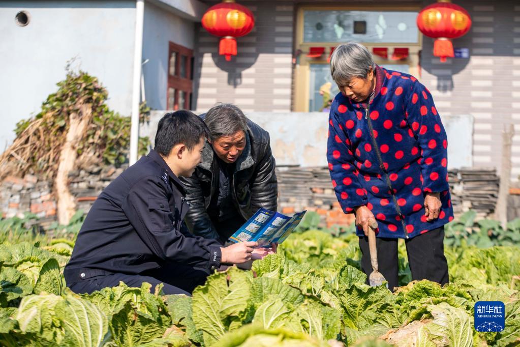 江蘇省泰州市海陵區(qū)蘇陳派出所民警在蘇陳社區(qū)田間地頭向農(nóng)戶進(jìn)行普法宣傳(2021年12月4日攝)。新華社發(fā)(湯德宏 攝)