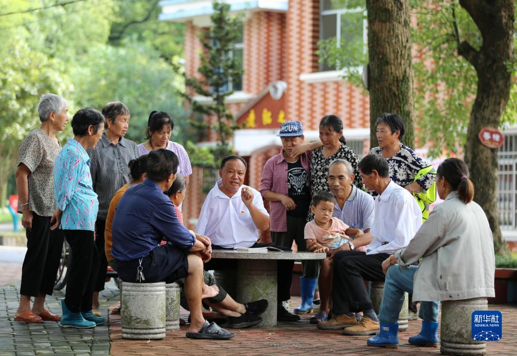 江西蘆溪縣宣風(fēng)鎮(zhèn)珠亭村人民調(diào)解員陽昌紹(中)為珠亭村的百姓宣講民法典知識(2021年8月17日攝)。新華社記者 胡晨歡 攝