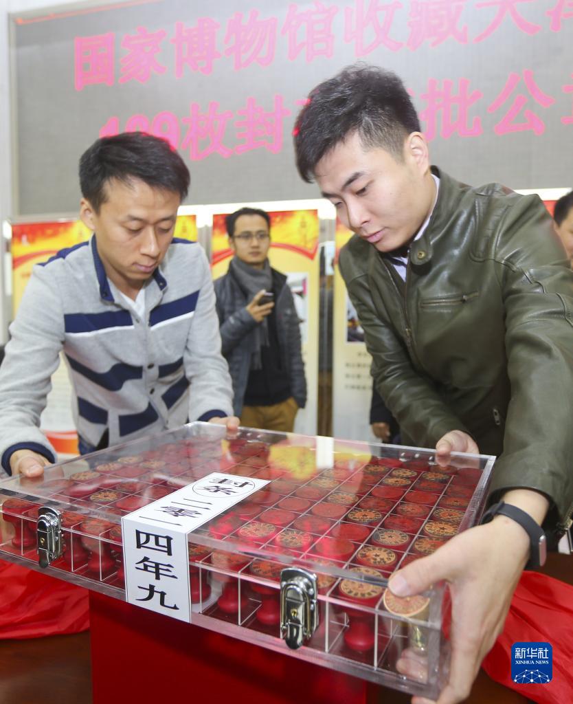 2014年11月15日,國家博物館工作人員搬走天津?yàn)I海新區(qū)109枚封存審批公章。新華社發(fā)(付文超 攝)