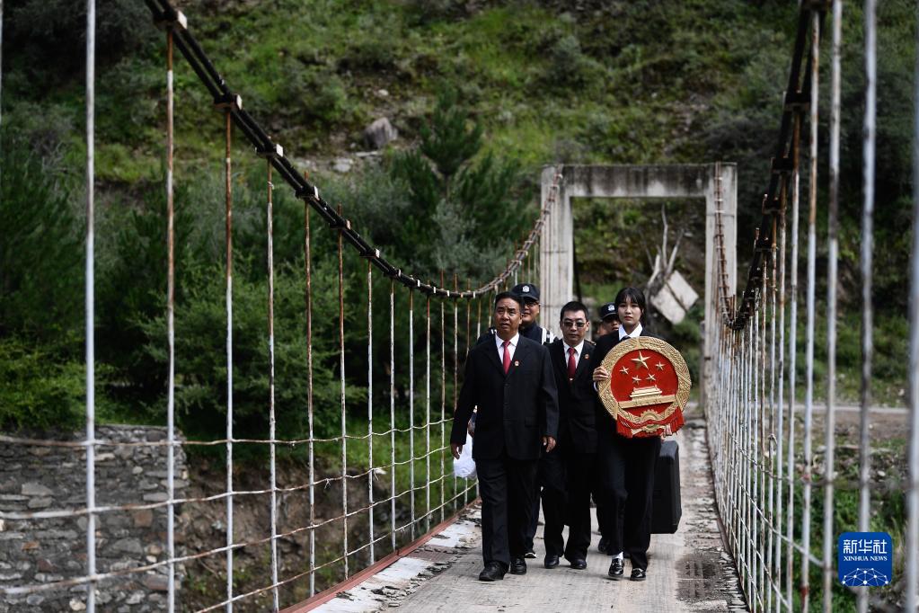青海省果洛藏族自治州班瑪縣人民法院巡回法庭成員前往班瑪縣燈塔鄉(xiāng)班前村提供法律服務(wù)(2021年8月7日攝)。新華社記者 張龍 攝