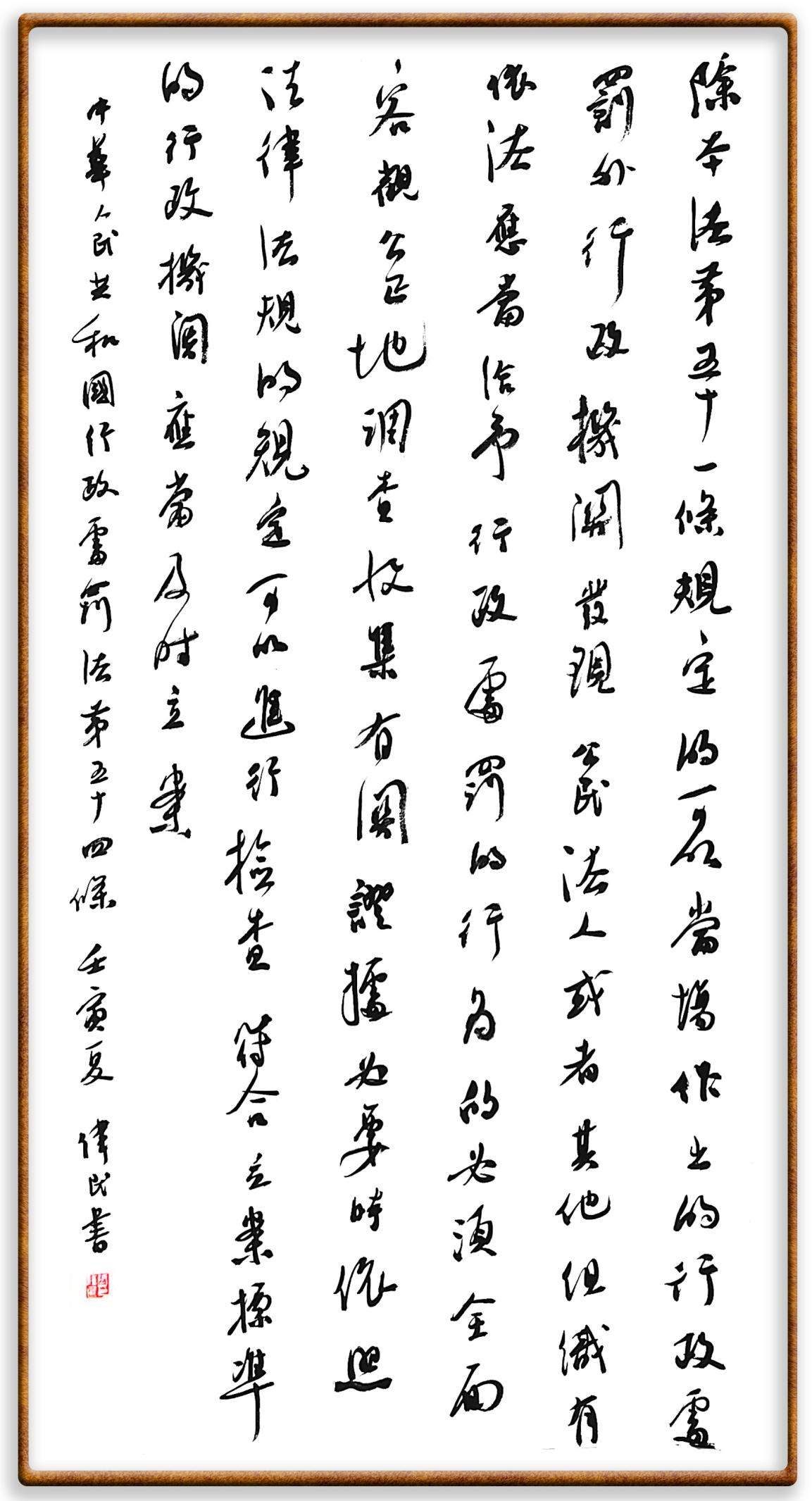繼《中華人民共和國民法典》《中華人民共和國土地管理法》《中華人民共和國土地管理法實施條例》《中華人民共和國法律援助法》之后,法治日報社聯(lián)合北京市司法局、北京書法家協(xié)會,將筆端對準(zhǔn)《中華人民共和國憲法》和《中華人民共和國行政處罰法》。